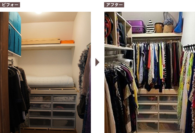 たたみ収納を減らし、吊り収納を増やすことで洋服が選びやすくなります。