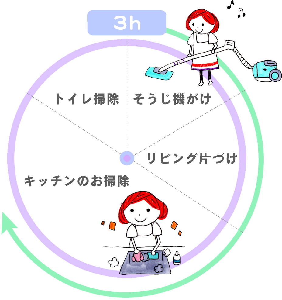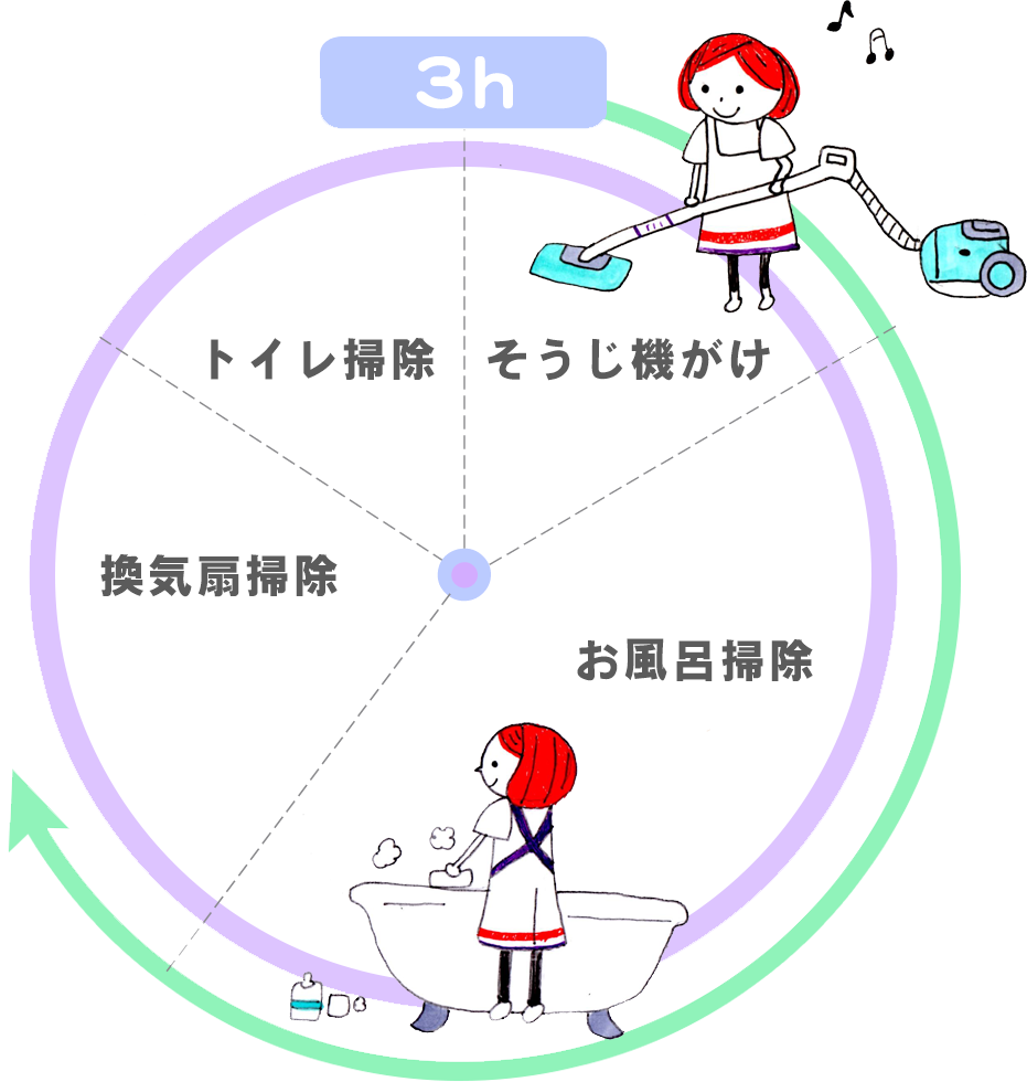 Q.家事代行サービスとは具体的にどんなことをしてもらえるのでしょうか?A.水回りのお掃除、掃除機がけ、洗濯等時間内で対応いたします。ご相談ください。