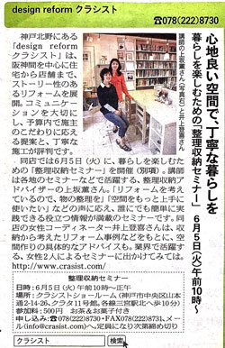 2月 リライフ山科様 「快適シニアライフセミナー」 4月 サンヨーホームズ(株)様 「快適シニアライフセミナー」 5月 伊丹市婦人会様 「生前整理のススメ」 6月 (有)クラシスト様 「暮らしを楽しむための整理収納セミナー」 7月 (株)ライフライン様 「整理収納で暮らしを快適に」 8月 JAF大阪支部様 「片付けが苦手な方向け整理収納の基本講座」 9月 (株)アプロサクセス様 「衣替えをしながら、クローゼットの整理収納術」 11月 西宮市立苦楽園小学校PTA 「ひとりでできるもん!」 ~子供が自分でできる収納システム作り~ 12月 (株)コーヨーテック様(赤穂) 「エコ掃除のススメ」 |