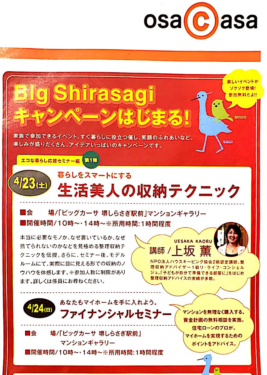ビッグカーサ堺しらさぎ駅前(オリックス不動産) 4月 暮らしをスムーズにする収納テクニック 5月 スマートに暮らすための収納テクニック 5月 セカンドライフセミナー 6月 整理収納セミナー 6月 賢い引っ越しテクニック 7月 驚きの収納術を学ぼう 11月 シングル 12月 引っ越しテクニック 11月 日本生命保険相互会社 布施支社様 「整理収納セミナー」 |